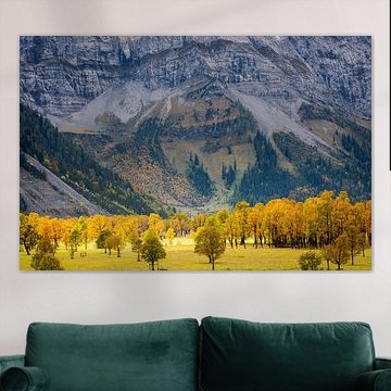 Maple trees at the Großer Ahornboden in Austria in autumn with massive rock face Robert Ruidl
