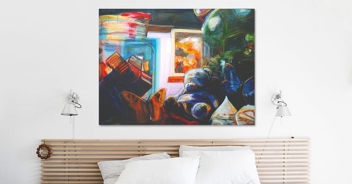 The paintings consist of many transparent acrylic paint layers. Variation with sharp and vague. There is always a particular figure or subject in the spotlight. The longer you look the more you will find in the artwork.