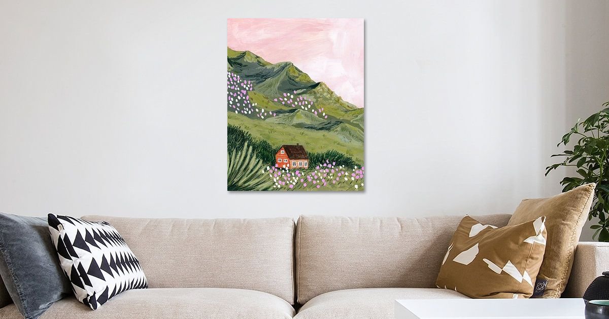 Walking through Sarah Gesek's paintings feels like a journey through the world's most beautiful places. This American artist captures nature's power in vibrant colors that directly touch your heart. From Icelandic mountain peaks in soft blue and purple tones to lush gardens full of bright pink flowers - each work shows her deep love for nature.