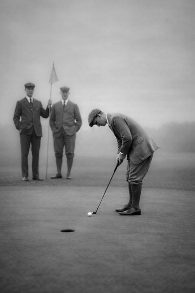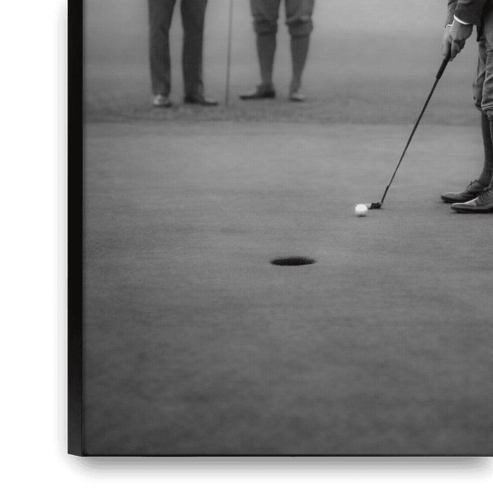 The golfer stands above the ball in complete concentration, not in action, but in preparation. Body, club, gaze and posture are carefully aligned. Everything superfluous is absent. The surroundings are restrained.