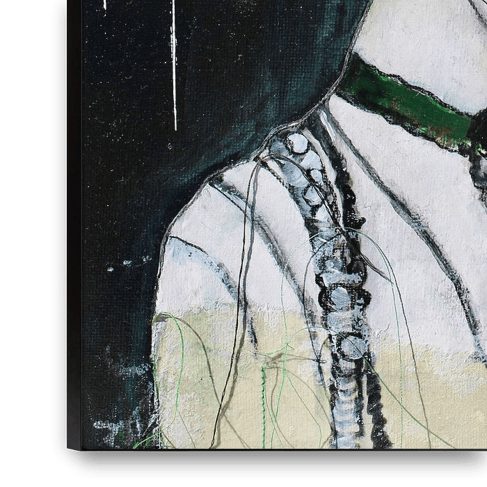 A figurative black and white work of acrylic, textile, paper and wire, with an accent of green.