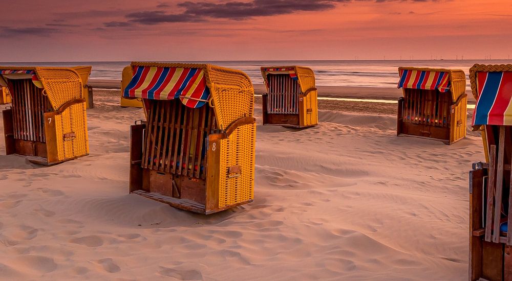 This photo was taken on Egmond beach. Here I actually photographed just next to the sunset. The row of chairs lead you to the horizon.