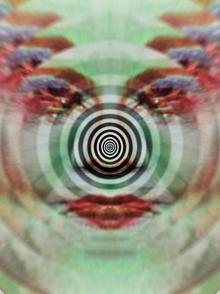 If you feel somehow hypnotized by this artwork, it's no coincidence. As you might have guessed, hypnosis is the theme of this piece. In scientific terms, hypnosis is a specific type of trance, what generally refers to an altered state of consciousness with reduced perception of the environment and diminished logical comprehension. Such states are characterized, among other things, by the blurring of boundaries and a certain ambiguity of impressions. This is also the concept of all psychedelic imagery, which is so well suited for this subject.
