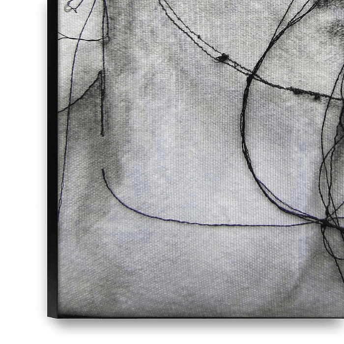 A figurative black and white work of needle and thread, a face powerful and vulnerable.