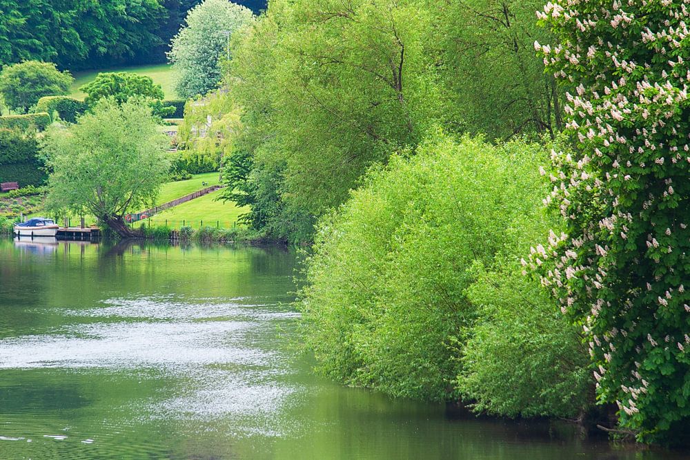 River in England lined with all kinds of green ( and some purple-red) deciduous trees. In the foreground a beautiful chestnut tree in blossom. In the background a pleasure boat at a jetty. And hidden between the ground at the front left another swan is swimming. The green shades of the trees are reflected in the water.