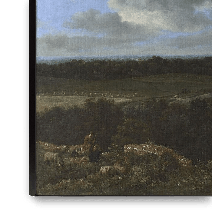 Although it is reminiscent of the countryside around Haarlem, where van Ruisdael grew up and trained as an artist, no one has been able to identify the main church or an exact location for the panorama. Most likely it was an idealised view, evoking and reflecting ideas that van Ruisdael and his customers had about how Holland should look. The productive nature of the landscape is represented by the shepherds, the corn and the windmill; a sense of history by the ruined castle. The church that dominates the horizon stood, in their eyes, for eternal certainty.