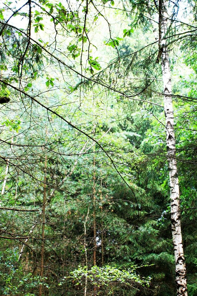 A graceful birch stands bathed in the soft morning light, surrounded by the quiet green of the forest.