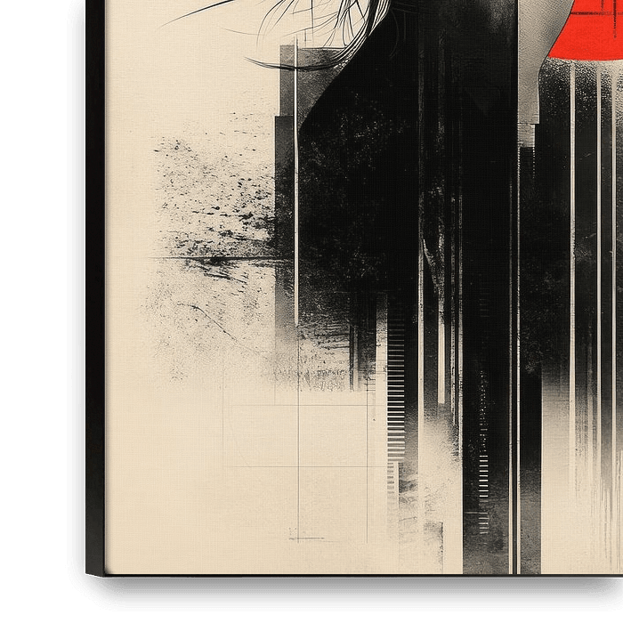 This captivating artwork blends the soft beauty of a woman's profile with bold abstract elements. A striking red circle frames her serene expression, symbolizing passion and strength, while the interplay of black geometric lines and textures adds a modern, urban edge. The monochromatic palette contrasts beautifully with the vibrant red,…