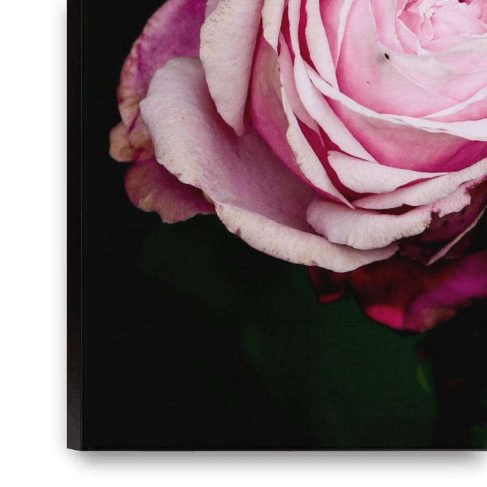 A close-up of a French Rose, pink petals with magenta buds against a dark background