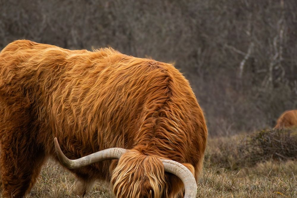 The animal's imposing horns and thick, reddish-brown fur stand out against the backdrop of bare trees and grassland, creating an authentic and peaceful scene. A second highlander can be seen in the distance, adding to the sense of a natural habitat.