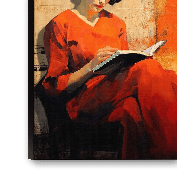 This atmospheric artwork captures a moment of serene calm and concentration. It shows a woman in a bright red dress engrossed in a book, against an abstract background of warm, rusty brown and beige tones.