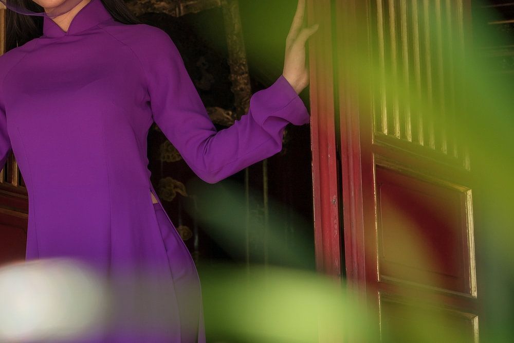 About "A Vietnamese woman in purple clothes emerges from the door of the temple"