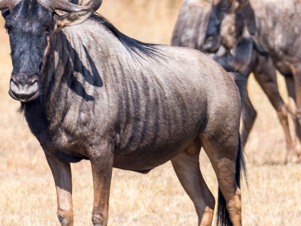 Many animals live on the Savannah, including this Wildebeest. You regularly come across them during a horseback ride. Here a male Wildebeest is "on guard" in defense of the rest of the herd.