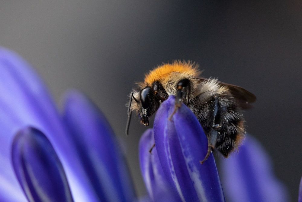 In spring, they are very busy. This bee, too, already has its body full of pollen. This photo lets you be close to nature, through the low perspective and warm colours. The bee is a nice contrast to its surroundings as it crawls over the leaves.