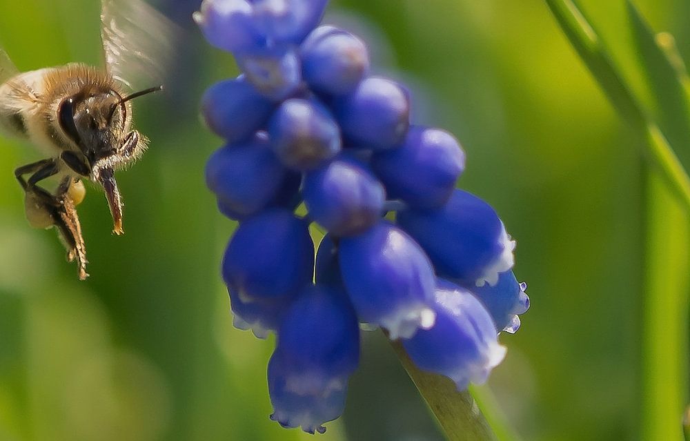 A bee in flight between grape hyacinths by Wolfgang Unger