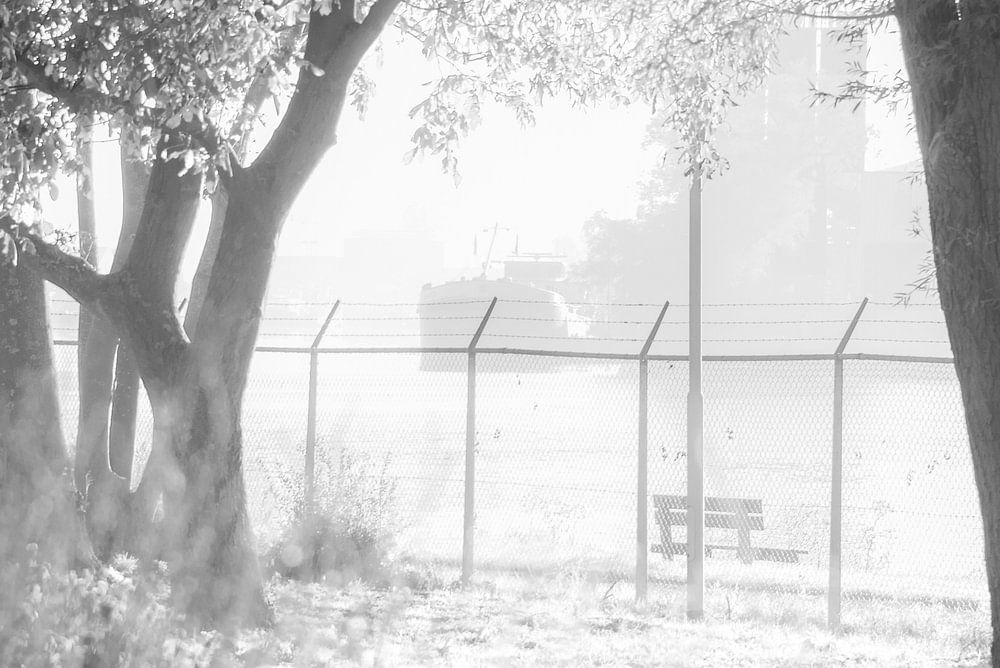 "A black-and-white photograph of a misty morning at the edge of a Hembrug park. A mesh fence and the canal separate the little park from the ship moored in the harbour opposite. Through the mist, the sun cautiously breaks through. The bare trees and empty bench emphasise the serene…
