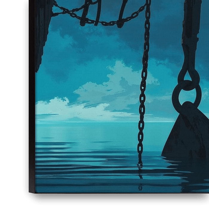 Another view of a fishing boat (cutter) - Through two rusty anchors from a large and old cargo ship, you can see a cutter, a medium-sized fishing boat in the black-blue night.