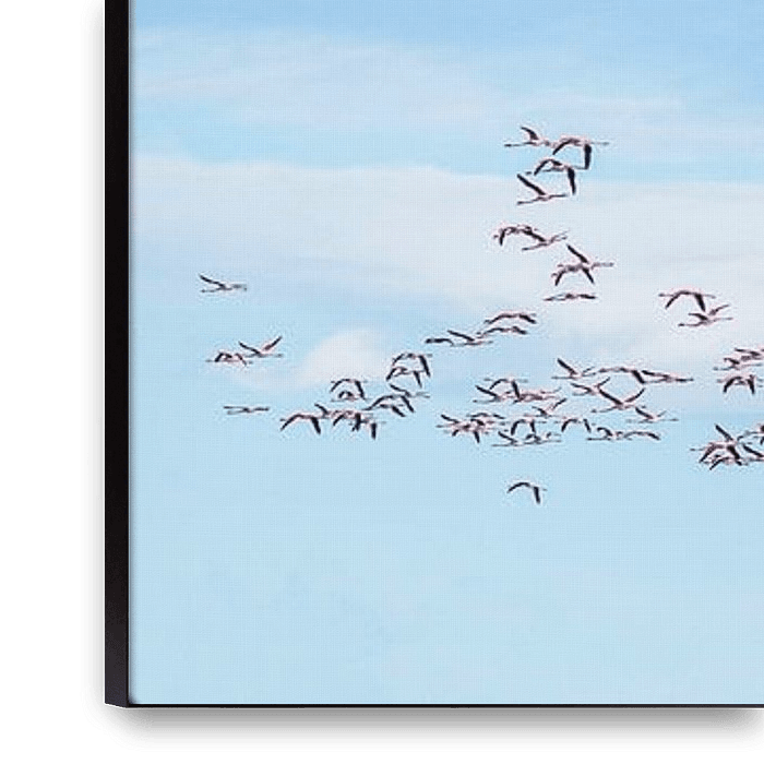 Buy the photo A flight of flamingo's by Hanneke Luit on canvas, ArtFrame, poster and wallpaper, printed on demand in high quality.
