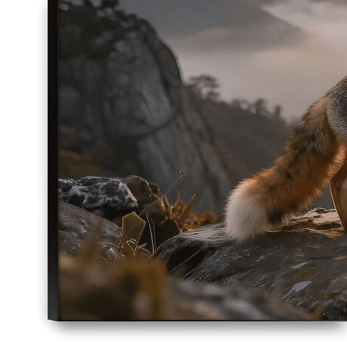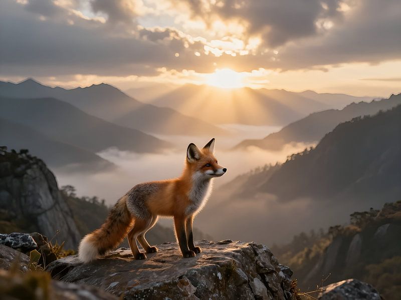 This realistic-looking artwork depicts a fox in the first light of day, surrounded by mist-shrouded valleys and rolling mountain ranges. The golden rays of sunlight break through the clouds, lending the scene an almost spiritual atmosphere. The fox appears alert yet serene – a silent observer against a majestic natural backdrop. The…