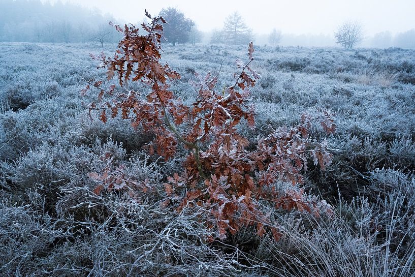 A solitary plant stands out against the frozen grass on the heath. Its leaves are covered in frost. Winter is just around the corner.