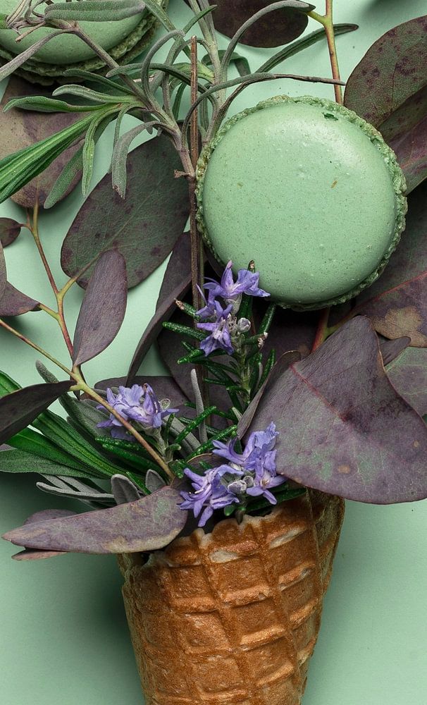 An ice cream cone filled with green elements such as macarons & eucalyptus