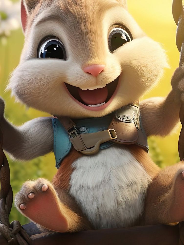 In this vibrant scene for a nursery, a happy squirrel radiates pure joy. With sparkling eyes and a broad smile on its snout, the squirrel almost seems to dance with joy. Its soft, fluffy fur radiates warmth and cuddliness, making it an inviting and reassuring image. This cheerful display creates a playful and cosy atmosphere, perfect for brightening up any child's room.