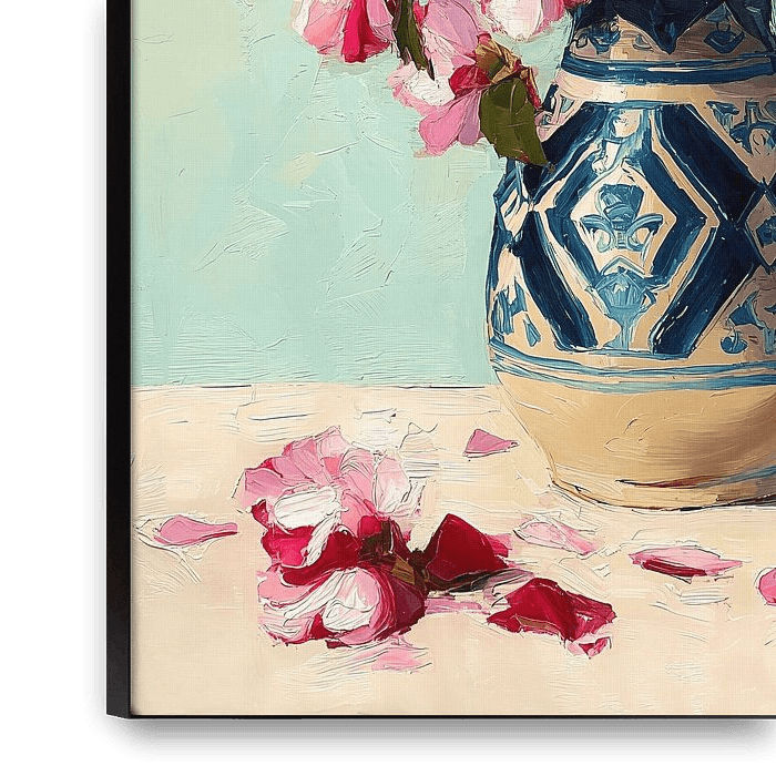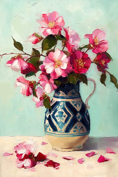 A painted ode to classical beauty: lush pink roses and flowers in full bloom, loosely arranged in a refined blue-and-white porcelain jug against a soothing mint green background. The windswept petals on the lower surface emphasize the ephemeral nature of beauty, while the artist's hand softly and impressionistically captures the moment…
