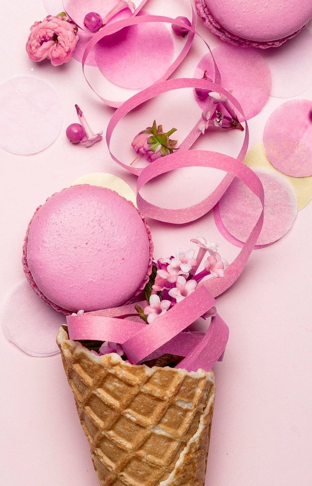 A pink party in an ice cream cone filled with macaroons, serpentine, confetti & flowers