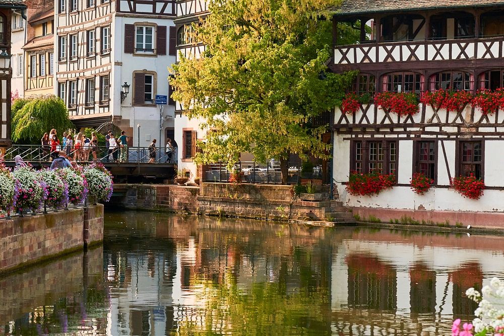 The old centre of Strasbourg, the so called la Petite France, on a beautiful summer day. The centre is a sea of flowers, everywhere along the water and on the houses hang beautifully tended flower boxes that make Strasbourg a cheerful, colourful flower city.