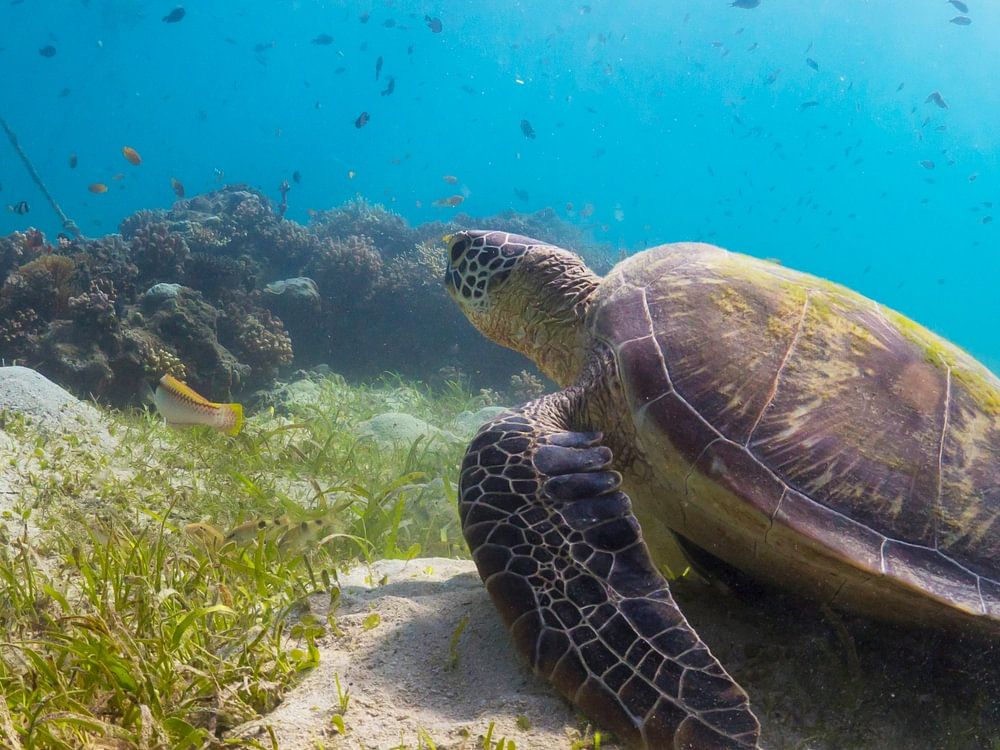 A sea turtle enjoying the sun among the sea grass