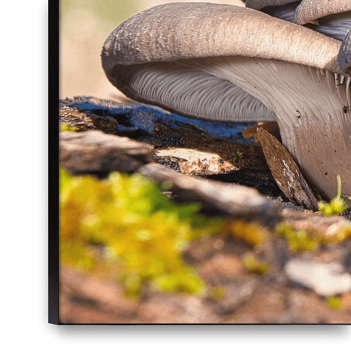 A shallow focus of brown Oyster Mushrooms growing on rocks on a sunny day