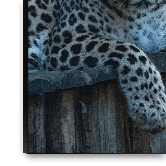 This striking portrait captures a snow leopard in a pensive pose: it lies relaxed on a wooden surface, its front paws elegantly draped over the edge, gazing almost directly into the camera. The thick, mottled coat in creamy white with black rosettes shimmers subtly, framed by a warm, dark background that enhances the mystical aura of…