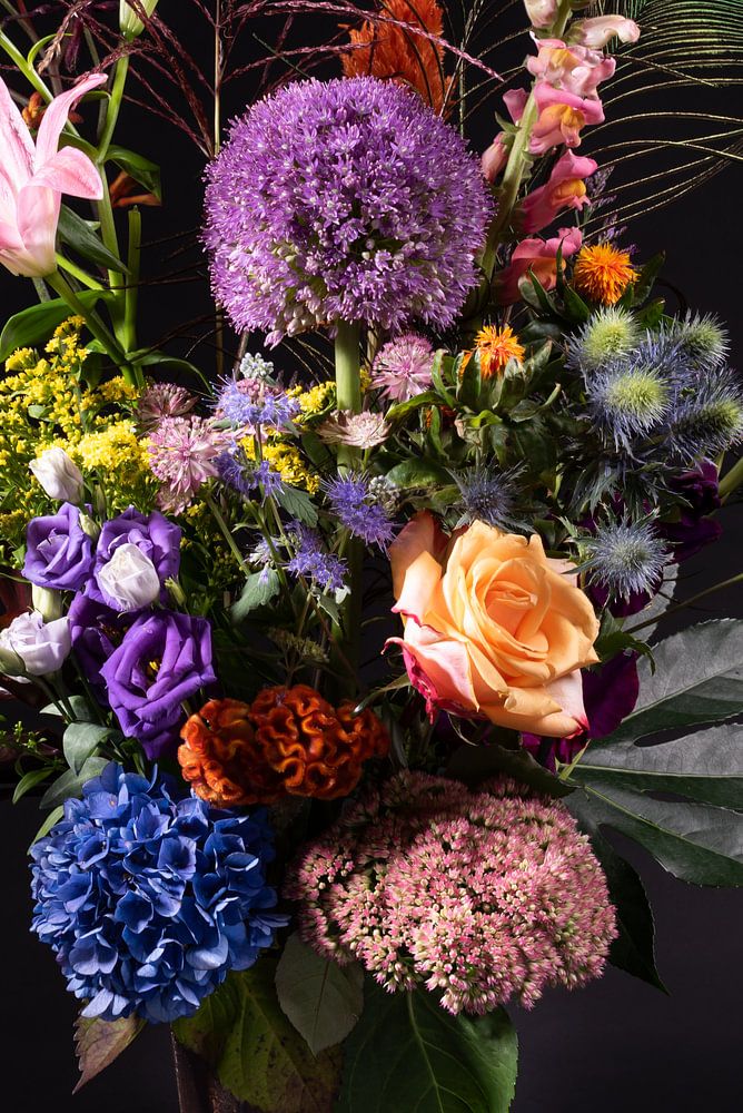 "A soothing bouquet of flowers with 2 peacock feathers" is a photograph of a still life of various flowers and two peacock feathers in a vase.