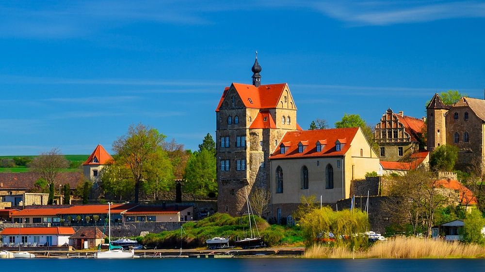 A view of the Süssen See near Seeburg in Saxony-Anhalt under blue skies