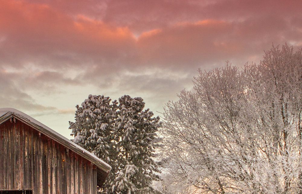 An old barn surrounds the snow in Jämtland Sweden. The sun sets early and the sky turns orange red
