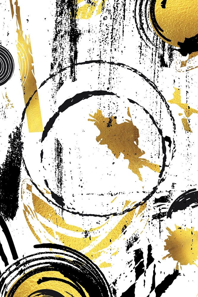 Modern abstract graphic art with an elegant touch. Experimental vector painting with different brushes in black and white with golden highlights. Dynamic and very appealing contemporary design.