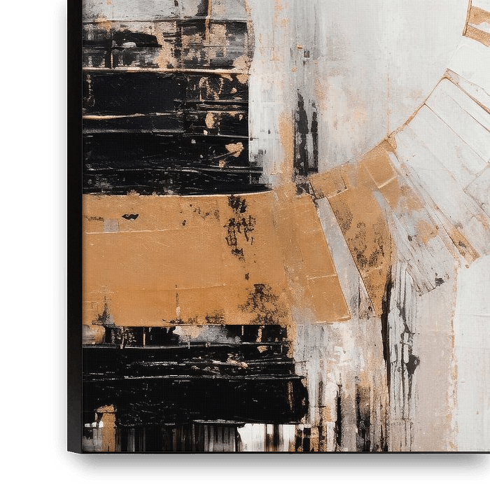 Modern art with gold-colored shapes, strong contrasts, and a texture in black and white. This abstract painting displays a timeless energy. The colors blend into a harmonious composition.