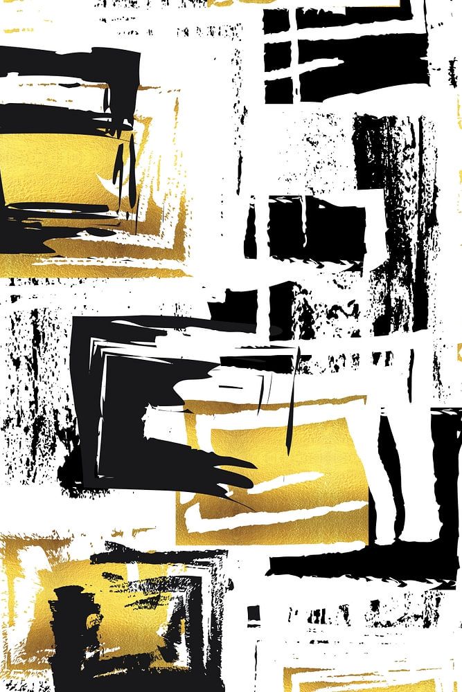 Modern abstract graphic art with an elegant touch. Experimental vector painting with different brushes in black and white with golden highlights. Dynamic and very appealing contemporary design.