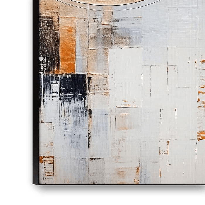 Modern art with golden geometric shapes, including circles and lines, stand out against a muted, abstract background. The design features a minimalist aesthetic with a mix of metallic sheen and soft neutral tones. This abstract painting displays a timeless and calm relaxation. The colors blend into a harmonious composition.