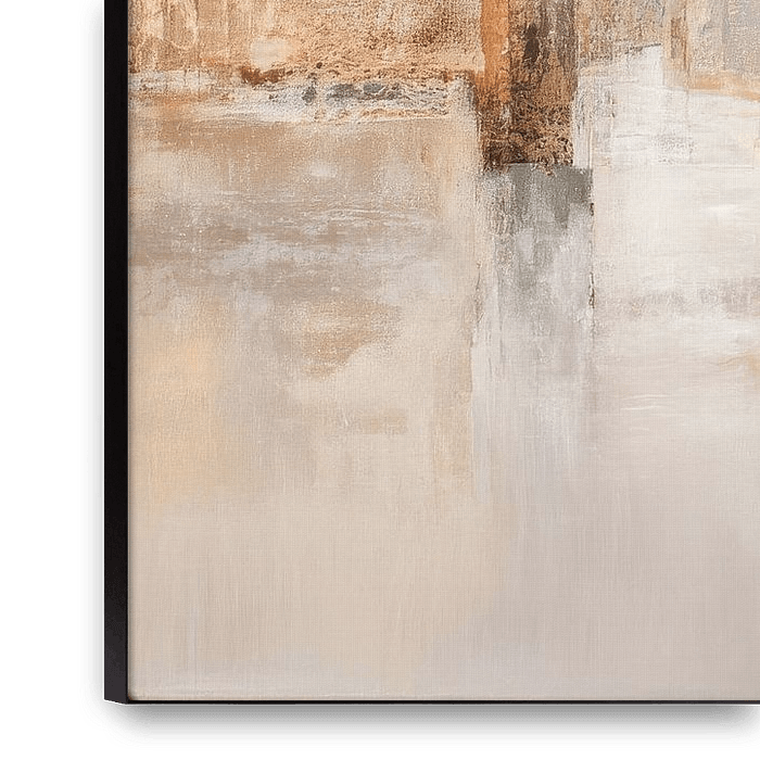 Gently layered areas of color form a tranquil, balanced composition of great depth. Warm beige, cream, and sand tones blend with cool gray nuances to create an abstracted landscape reminiscent of urban silhouettes, layering, and soft horizons. The delicate textures and gentle transitions evoke a meditative effect, making the image…
