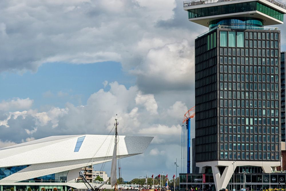 Two distinctive buildings on the north side of Het IJ in Amsterdam. For the buildings, an old butter with sailed sail sails.