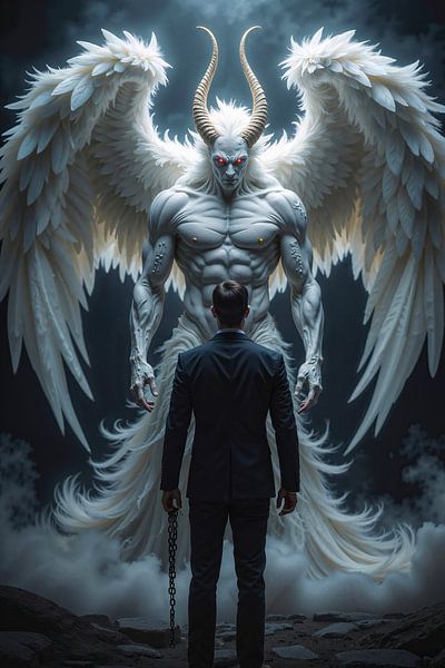 In a scene of mist, darkness and supernatural stillness rises a towering figure of overwhelming presence. The white demon stands with outstretched wings like a fallen titan, its appearance both pure and terrifying. Its skin seems carved from marble, marked by cold perfection, while its glowing eyes gaze upon the world with merciless…