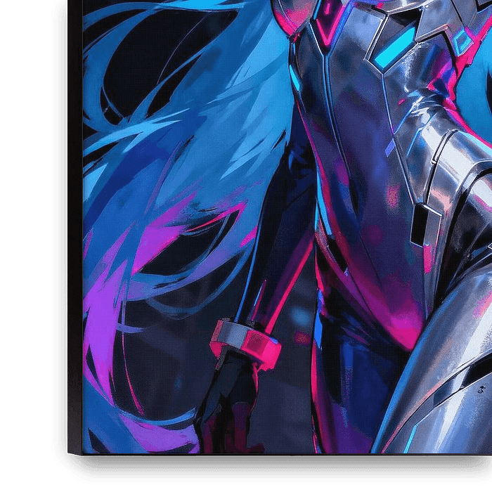 Step into a high-tech future with this breathtaking ANIME sci-fi illustration. The artwork features a stunning long-haired blue android girl clad in a sleek, reflective silver mecha bodysuit. Her metallic armor brilliantly captures and reflects the vibrant glows of neon fuchsia and electric cyan from a dark, industrial cyberpunk…