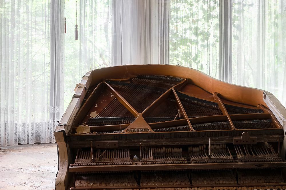 This is a photo of a piano on the floor in an abandoned house. The house is located in a lovely area almost next to a beautiful lake. There were a lot of new and modern houses surrounding this house. You can barely see it, since it's covered in trees and plants. If you don't know where it is, you'd walk right past it. A true 'hidden' gem.