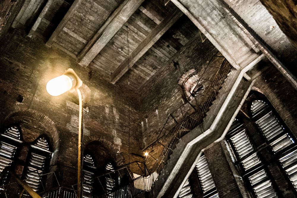 Series of photos of an abandoned church in St.Mary's church in Gdansk, a town in Poland. Lots of stairs, windows and different lights, kind of lamppost. Urban style.