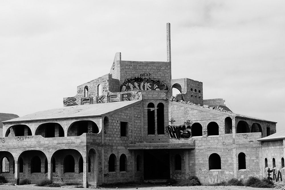 An abandoned hotel construction near Parque Holandés on the island of Fortuventura. Construction began in 1980 as part of a luxury marina project for the area but has never been completed.