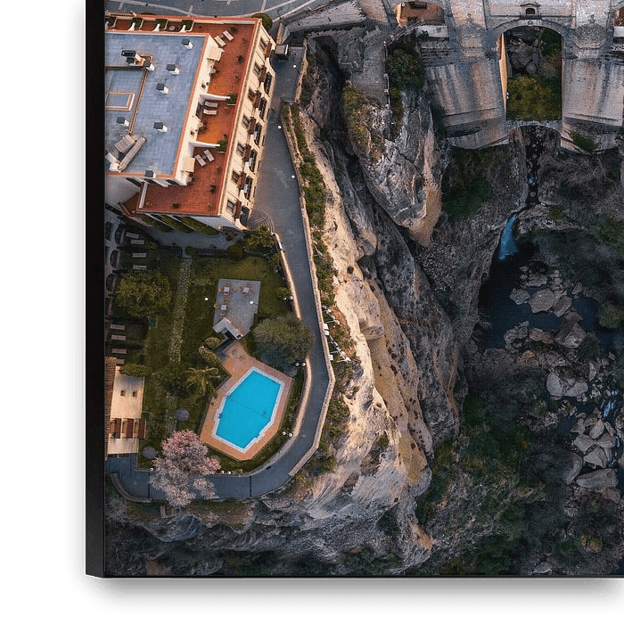 From a bird's eye view, the spectacular heart of Ronda unfolds. The ancient city seems to balance on the edge of the deep El Tajo gorge, where steep rock faces drop vertically downwards. In the centre of the image, the imposing bridge connects the two parts of the city — an architectural masterpiece that brings history and landscape…