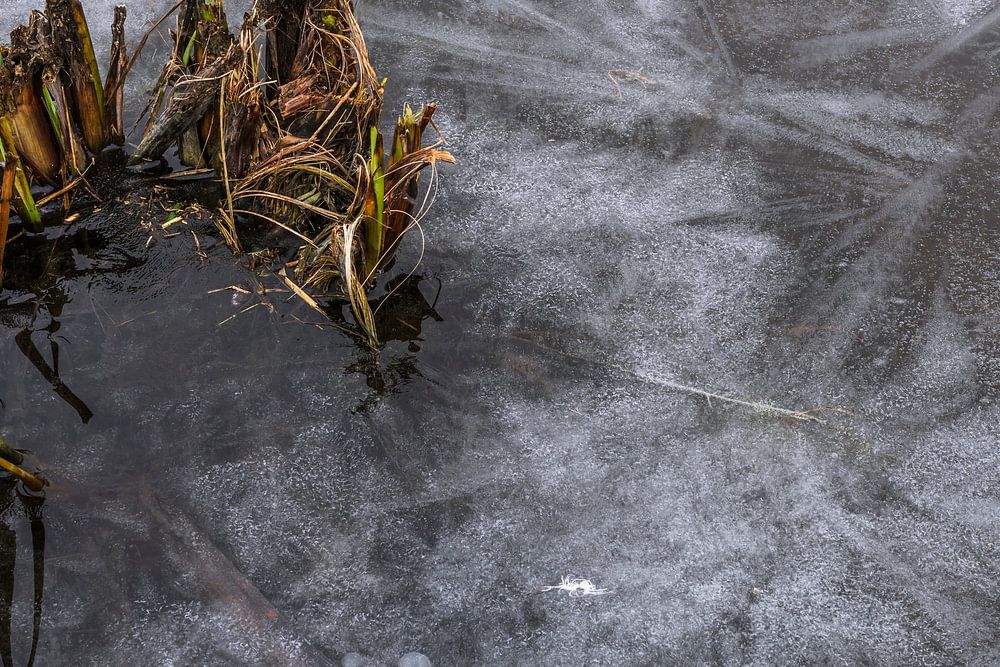 A detail shot of a piece of natural ice. Cut reeds protruded above the ice surface and formed a nice break in the ice structures.