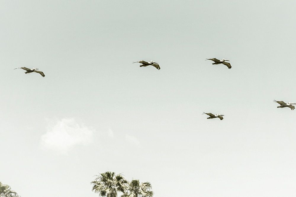 Birds are flying over the rooftops near the Sunset Cliffs.