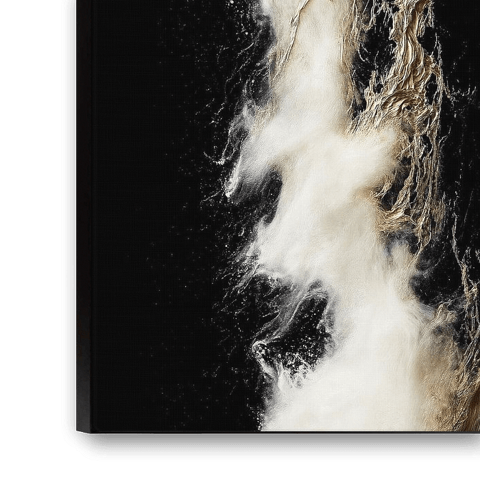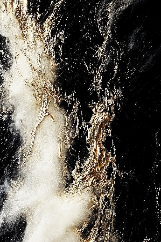 The collection reveals a rich and varied universe, where fluid forms evoke liquid waves and elegant marbling, while more intense compositions recall powerful impacts, cosmic spurts and flashes of light in motion. Some works exude a dramatic intensity thanks to the depth of blacks and metallic contrasts, while others favour the poetic softness of pastel backgrounds, rosy hues and luminous transparencies.